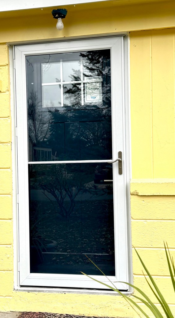 The view we have all been waiting for! Our finished street view! We painted our house yellow earlier in the summer/fall and on Thursday the security door was installed. It’s a quite sturdy steel door, painted blue on the exterior and white on the interior. We also installed a new storm door with full view glass (so you can see the pretty deep blue color of the door more), and a built-in retractable screen. On those rare perfect spring/fall days where it’s warm out, but not hot enough to have the AC running, we would like to be able to open the house up to a nice cross breeze and some fresh air.