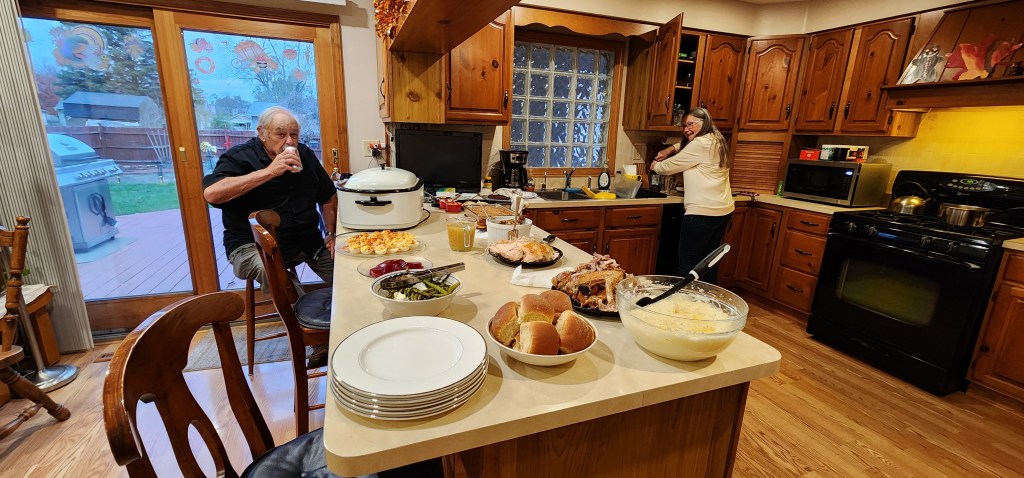 We got ready and headed over to Mom & Dad’s for Thanksgiving dinner. We got to nibble on crackers and cheese spread as an appetizer — I really love the Chicken in a Biscuit crackers with the sharp cheddar spread! While we were hanging out, we upgraded Dad to YouTube Premium, so he wouldn’t have to deal with ads any more. I think it was the best present we could have gotten him!