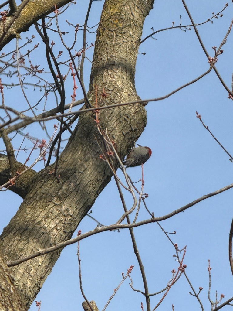 For several years, we have used the Merlin Bird ID app to identify different birds while on our walks. This morning, I heard a different bird (from our usual robins and house sparrows), and it said it was a red-bellied woodpecker. I stepped out on the porch and quickly found the little guy on a tree in our front yard!