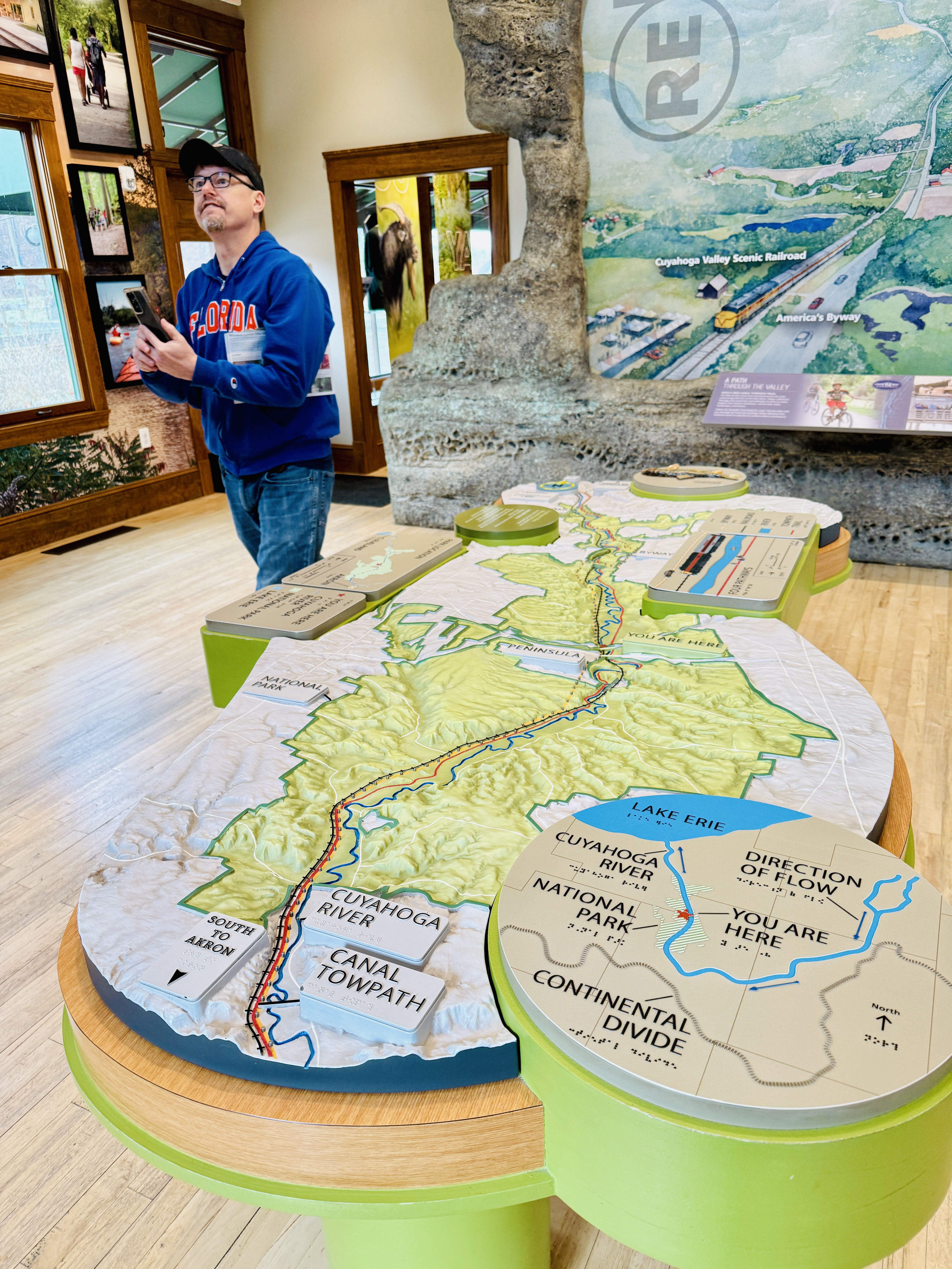 Our first stop was the Boston Mill Visitor Center at Cuyahoga, our 15th National Park! It was very interesting in that this National Park seems to focus more on the industrial importance of the area between Cleveland and Akron vs. nature/geological attractions. This visitor center is built right next to the Cuyahoga river and a railroad, and we were quite surprised to see a ski resort right across the street with people skiing.