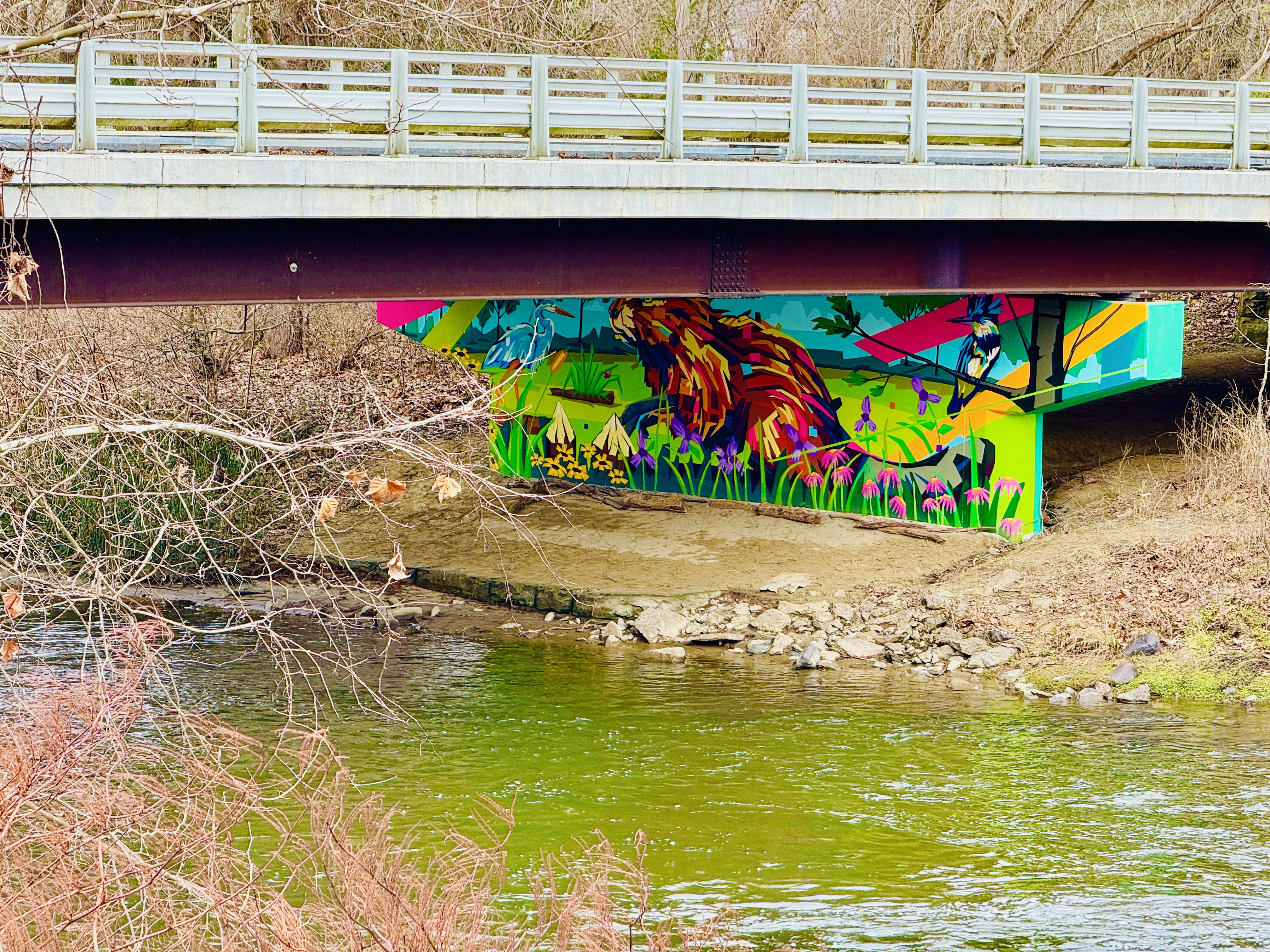 Outside of the visitor center main building, there is a viewing platform overlooking the Cuyahoga river. Our eyes were immediately drawn to the colorful mural under the overpass for the road. Just to the right, there is another cute, little bridge allowing for non-vehicle traffic to cross the river.