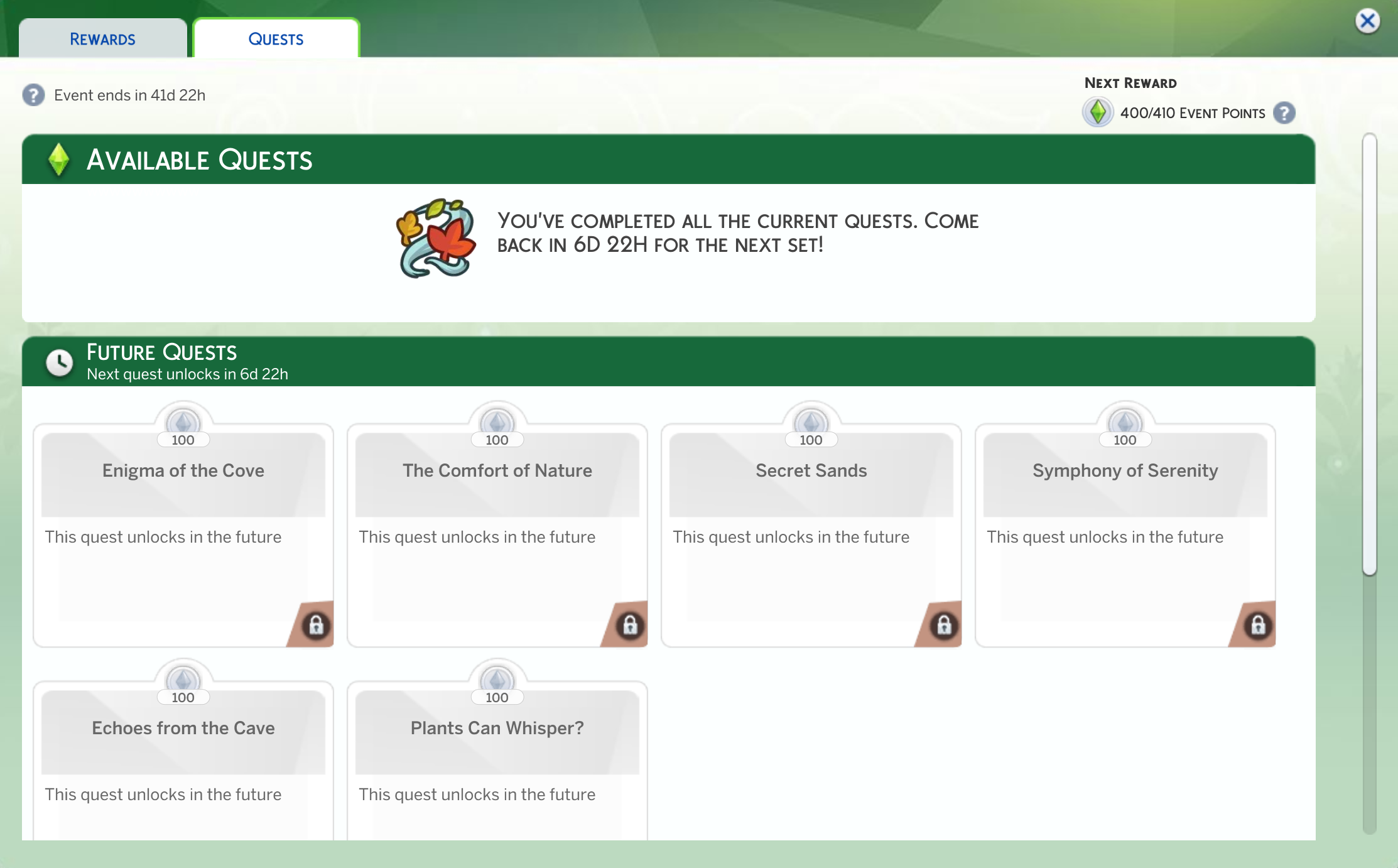 The first quest, Whispers on the Wind, had two required and one optional tasks. The optional tasks in this event require specific content to have been purchased for your version of Sims 4.