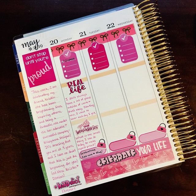 2. In the planner community, we #KADdicts (the Krissyanne Designs (KAD)-addicted members), are celebrating with her this week. Her shop (www.krissyanne.com) is offering special anniversary items, discounts, and daily deals all week long. Many of us are recognizing this by featuring her products and giving shout-outs on social media, and using her stickers in our planners. This “Don’t Stop Until You’re Proud” sticker is one of her “vintage” stickers. It was printed in the older formatting, before she moved to vinyl stickers (which have since changed again to a reposition able formulation). In my planner photo (featured), you can see stickers from Krissyanne Designs from near the beginning of when I discovered her shop to stickers from her line at Michael’s.