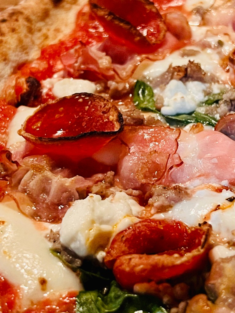 We went with the Pozzuoli (Italian Fennel Sausage, Old-World Pepperoni, Red Onions, Fresh Basil, Portobello Mushrooms, Fior di Latte Mozzarella), and took off the mushrooms and onions, and added goat cheese and prosciutto.