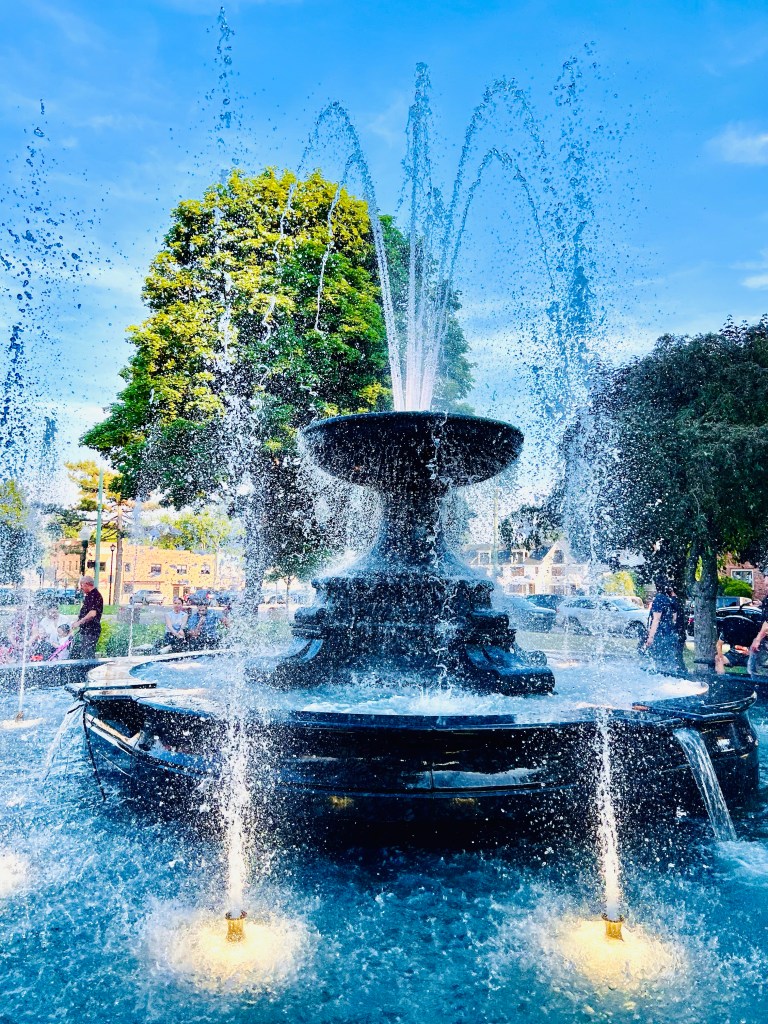 We generally enjoy going on a light walk after dinner, and Kellogg Park was just steps away from Pizza e Vino. It was a gorgeous evening: warm with a breeze. Lots of people were also enjoying the park and the fountain.