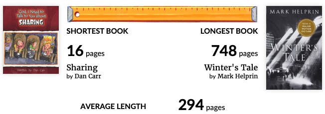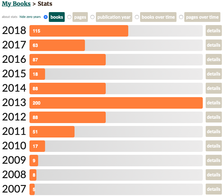 Looking at page counts over the past several years, you can see how I stopped reading so many short children’s books and started reading more adult or YA books. So, while I had read almost twice the number of books in 2013, my page count in 2018 is greater.
